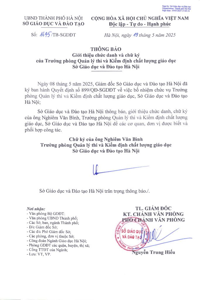 Thông báo Giới thiệu chức danh và chữ ký của Trưởng phòng Quản lý thi và Kiểm định chất lượng giáo dục ByAdmin20/05/2025in Văn bản quy phạm pháp luật, Thông báo, Tin tức - Sự kiện 0 Kế hoạch số 1554: Kế hoạch thực hiện công tác bảo vệ bí mật nhà nước năm 2025 Phân quyền, phân cấp trong lĩnh vực quản lý Nhà nước của Bộ Giáo dục và Đào tạo Admin Related Posts Thông báo Tin tức - Sự kiện Văn bản quy phạm pháp luật Hà Nội công bố danh mục thủ tục hành chính được sửa đổi, bổ sung trong lĩnh vực giáo dục và đào tạo ByAdmin11/07/2025 0 Thông báo Tin tức - Sự kiện Văn bản quy phạm pháp luật Công bố 100 thủ tục hành chính mới, sửa đổi, bổ sung, thay thế lĩnh vực giáo dục và đào tạo thuộc chức năng quản lý nhà nước của Sở Giáo dục và Đào tạo Hà Nội. ByAdmin27/06/2025 0 Tin tức - Sự kiện Văn bản quy phạm pháp luật Phân quyền, phân cấp trong lĩnh vực quản lý Nhà nước của Bộ Giáo dục và Đào tạo ByAdmin12/06/2025 0 Văn bản quy phạm pháp luật Thông báo Tin tức - Sự kiện Thông báo Giới thiệu chức danh và chữ ký của Trưởng phòng Quản lý thi và Kiểm định chất lượng giáo dục ByAdmin20/05/2025 0 Tin tức - Sự kiện Văn bản quy phạm pháp luật Kế hoạch số 1554: Kế hoạch thực hiện công tác bảo vệ bí mật nhà nước năm 2025 ByAdmin13/05/2025 0 Tin tức - Sự kiện Văn bản quy phạm pháp luật Sở Giáo dục và Đào tạo Hà Nội ban hành Công văn số 1328/SGDĐT-VP ByAdmin26/04/2025 0