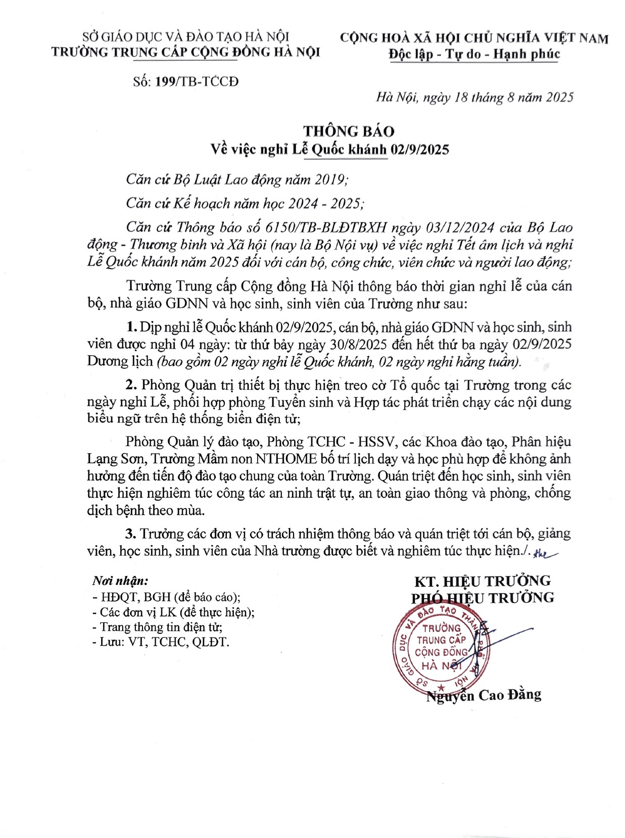 Trường Trung cấp Cộng đồng Hà Nội thông báo lịch nghỉ Lễ Quốc khánh 02/9/2025 ByAdmin18/08/2025in Tin tức - Sự kiện, Đào tạo, Thông báo 0 Giảm căng thẳng thi lớp 10: Đừng để vào trường nghề là giải pháp cuối cùng 80 năm Cách mạng Tháng 8 thành công – Dấu son thiêng liêng trong lịch sử dân tộc Việt Nam Admin Related Posts Tin tức - Sự kiện Thông báo Nghị quyết số 71-NQ/TW của Bộ Chính trị về đột phá phát triển giáo dục và đào tạo ByAdmin20/09/2025 0 Tin tức - Sự kiện Hướng nghiệp Nghị quyết số 71-NQ/TW: Chuyển động lớn từ định hướng chuyển đổi số ByAdmin20/09/2025 0 Tin tức - Sự kiện Đào tạo Hướng nghiệp Bảo đảm quyền tự chủ toàn diện, đầy đủ cho cơ sở giáo dục nghề nghiệp ByAdmin09/09/2025 0 Tin tức - Sự kiện Toàn văn: Diễn văn của Bộ trưởng Bộ GD&ĐT tại Lễ kỷ niệm 80 năm truyền thống ngành giáo dục và Khai giảng năm học 2025-2026 ByAdmin06/09/2025 0 Tin tức - Sự kiện Thư Chủ tịch nước Lương Cường gửi ngành Giáo dục nhân dịp khai giảng năm học 2025 – 2026 ByAdmin04/09/2025 0 Tin tức - Sự kiện Hướng nghiệp 80 năm Giáo dục phát triển đất nước – Bài 5: Sánh vai với cường cuốc năm châu ByAdmin04/09/2025 0
